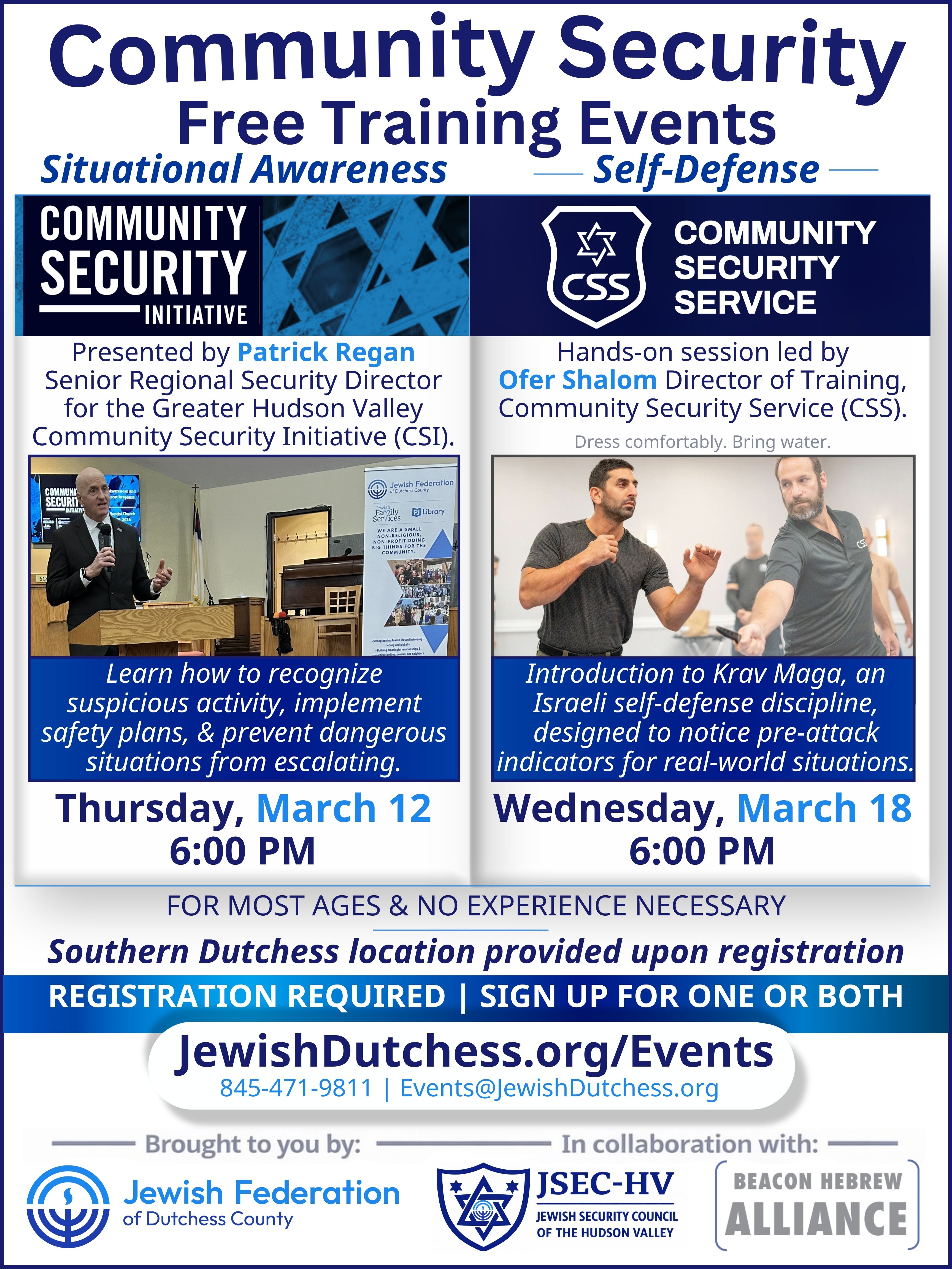 The program will explore how to identify concerning behavior, strengthen personal and communal awareness, and respond calmly and effectively under pressure. It will be led by Patrick Regan, Senior Regional Security Director for the Greater Hudson Valley Community Security Initiative (CSI), with time for questions and discussion.