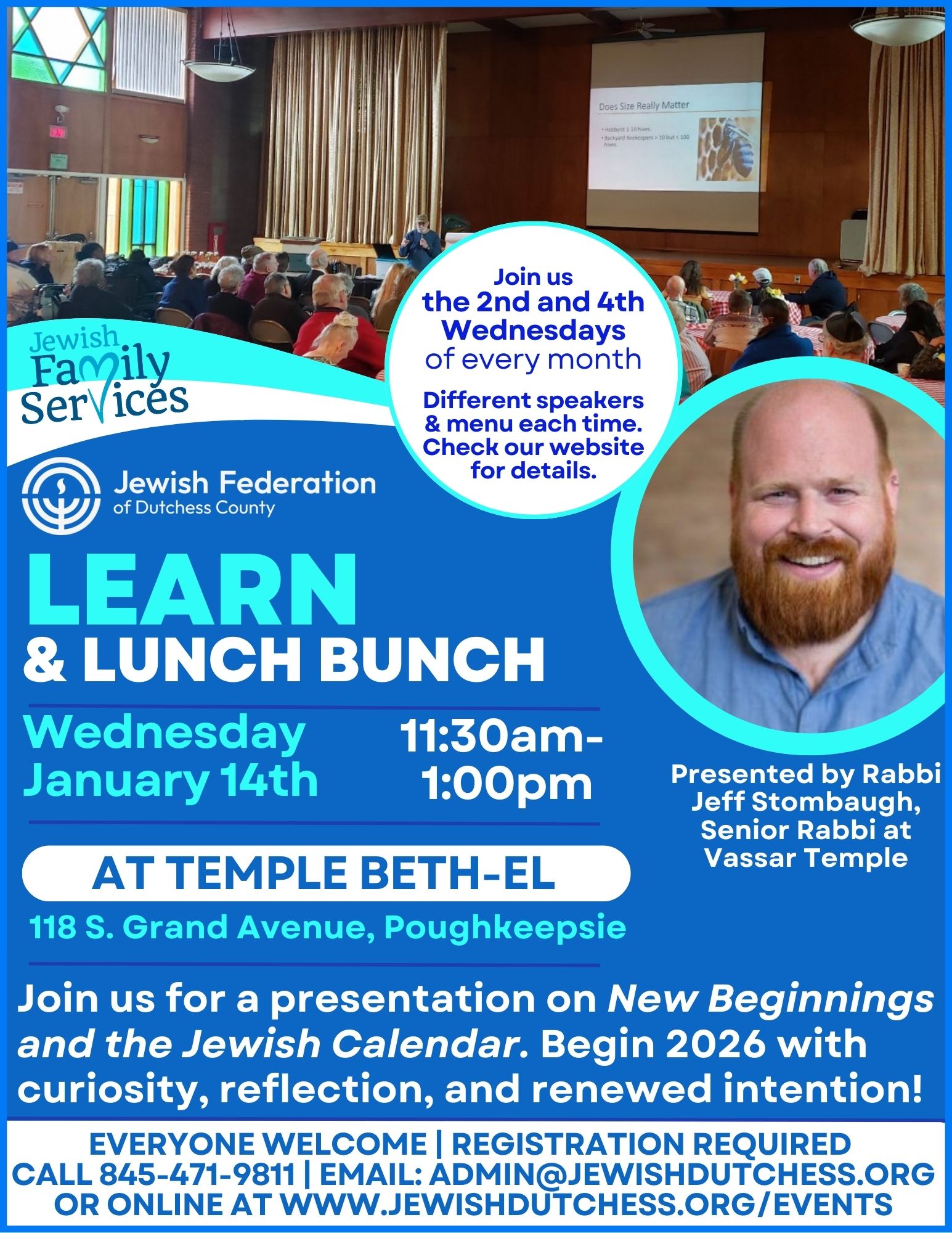 Presented by Rabbi Jeff Stombaugh, Senior Rabbi at Vassar Temple. The Jewish calendar is a beautiful, cyclical guide to living with intention. It carries us through spiritual highs and lows, offering festivals that lift us up and moments that invite us to sit gently with what it means to be human - always grounded in community. During our time together, we'll explore the holidays you know and love, along with others that may be less familiar, to understand the full sweep of how Judaism marks sacred time. Together, we'll consider how these rhythms can shape our own lives with meaning and purpse. Looking forward to learning with you all as we begin 2026 with curiosity, reflection, and renewed intention!