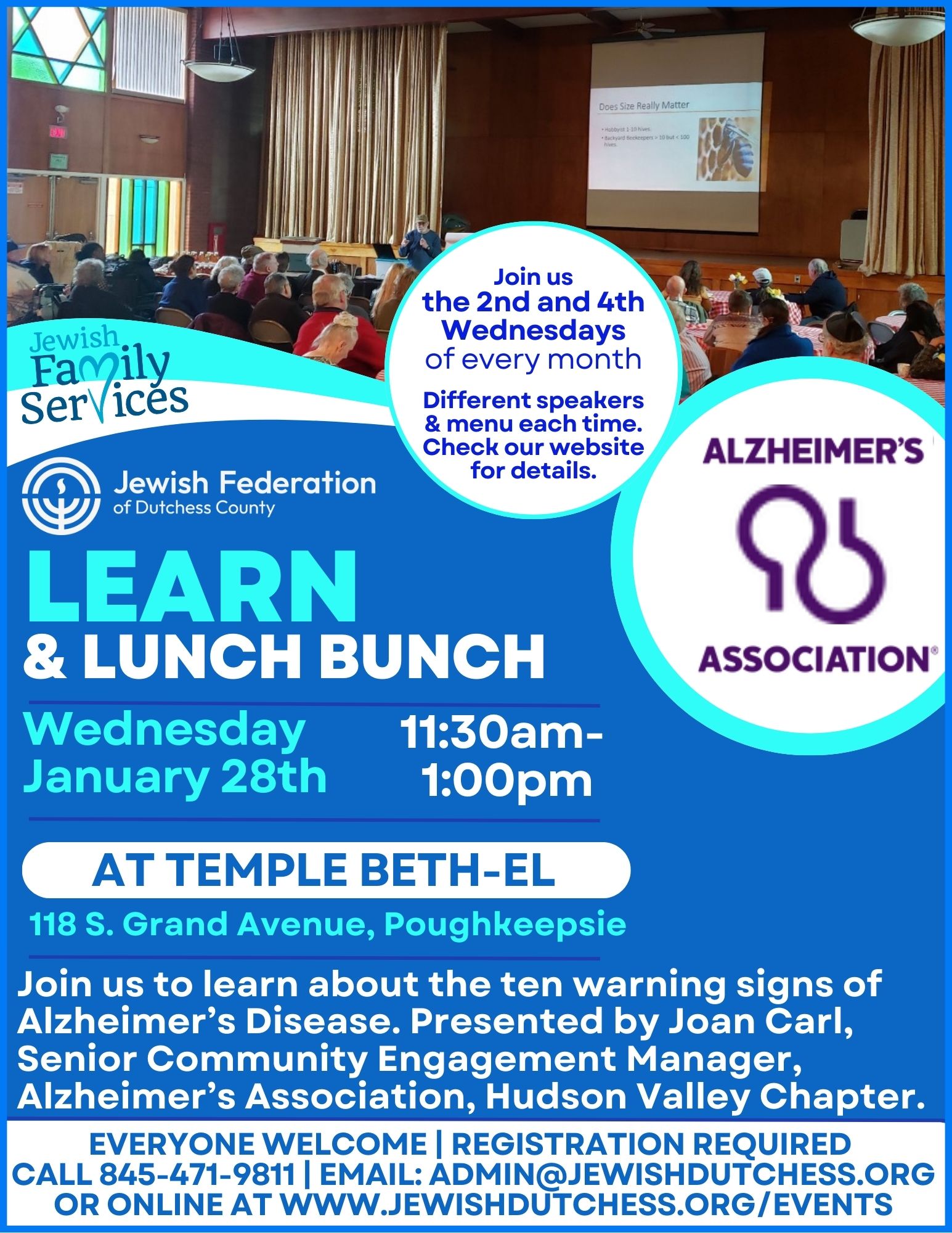 Join the Jewish Federation of Dutchess County and Jewish Family Services for a presentation on the ten warning signs of Alzheimer's Disease.