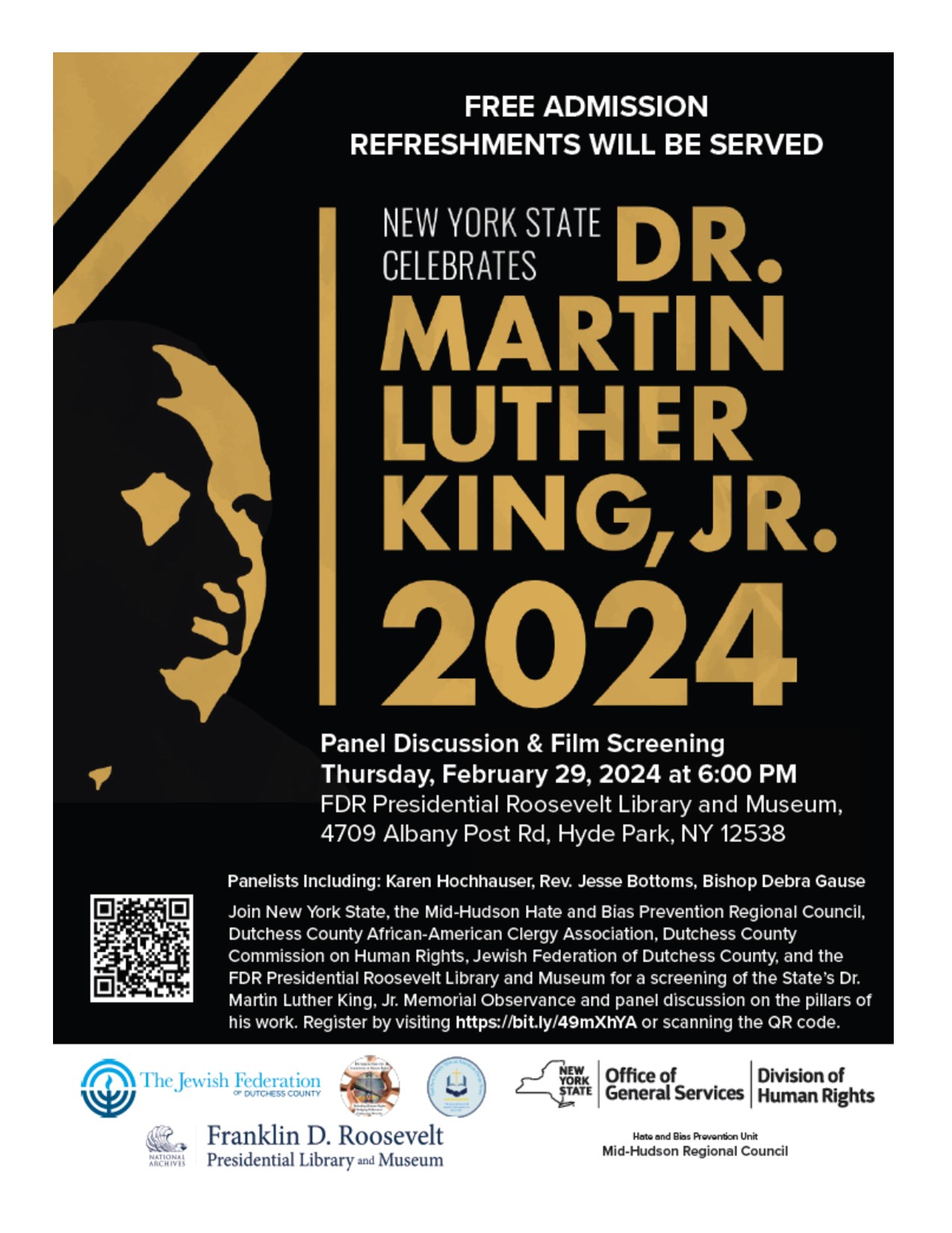 NOTE: DATE CHANGE! NYS Celebrates Dr. Martin Luther King, Jr. 2024 Panel Discussion & Film Screening Thursday, February 29th: 6pm at Franklin D.Roosevelt Presidential Library and Museum