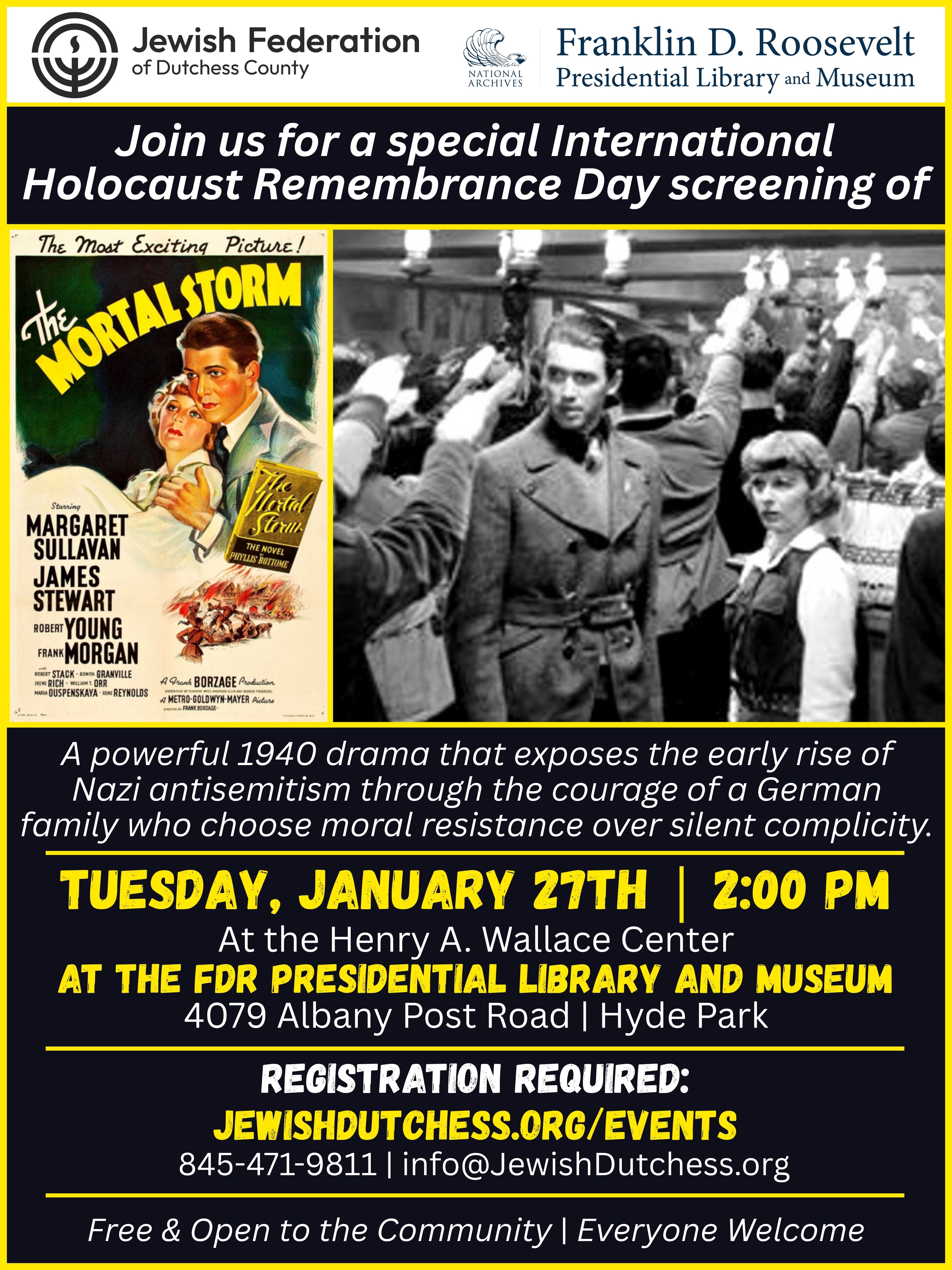 In honor of International Holocaust Remembrance Day, the Jewish Federation of Dutchess County and the Franklin D. Roosevelt Presidential Library and Museum invite the community to a special screening of The Mortal Storm (1940), one of the earliest Hollywood films to confront the rise of Nazi antisemitism.