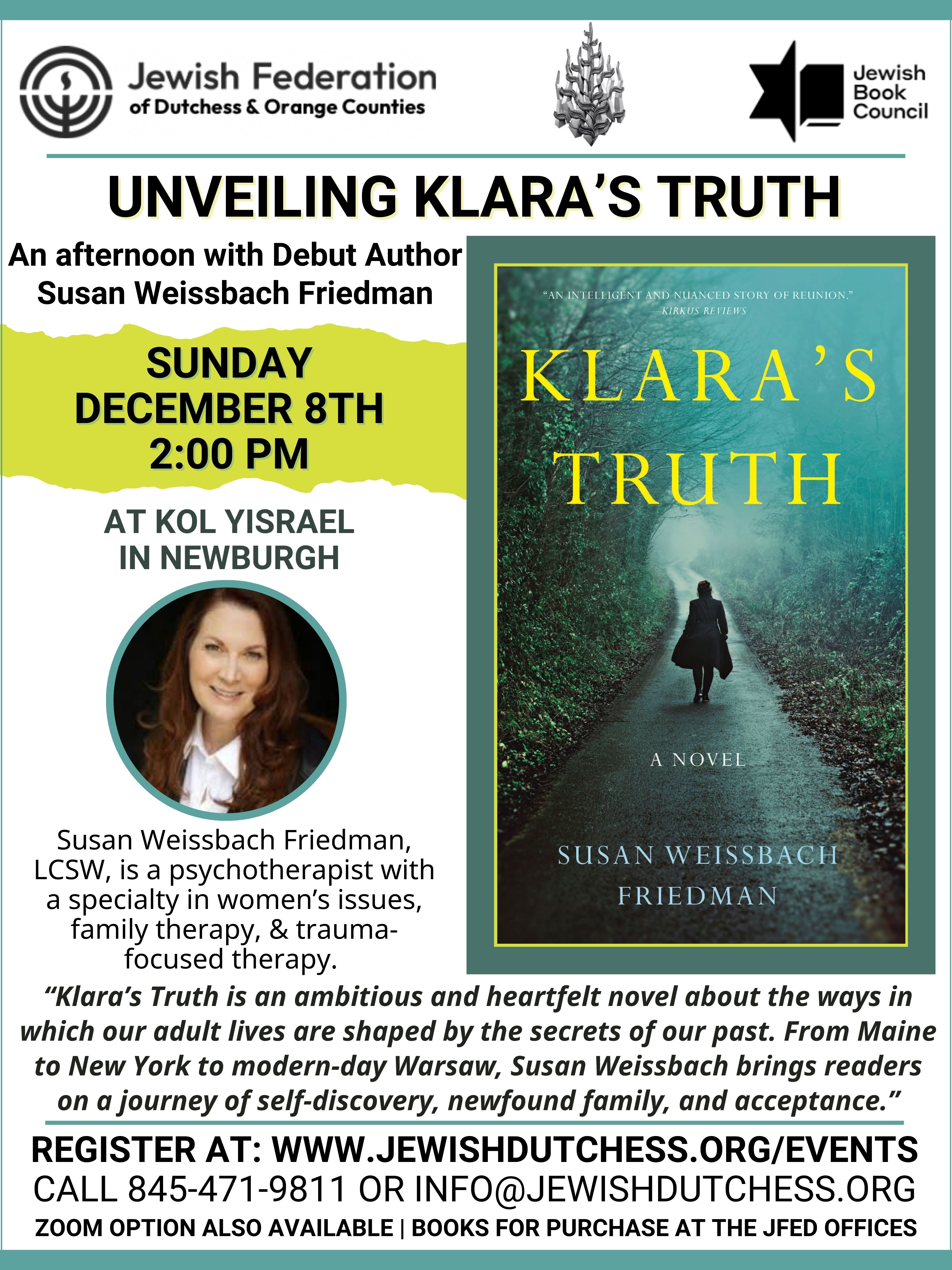 "Klara's Truth is an ambitious and heartfelt novel about the ways in which our adult lives are shaped by the secrets of our past. From Maine to New York to modern-day Warsaw, Susan Weissbach brings readers on a journey of self-discovery, newfound family, and acceptance."