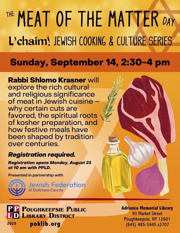 Join us on for our second to last event of the series on Sunday, September 14th at Adriance Memorial Library for "The Meat of the Matter" to delve into Jewish meat dishes! All are welcome!
