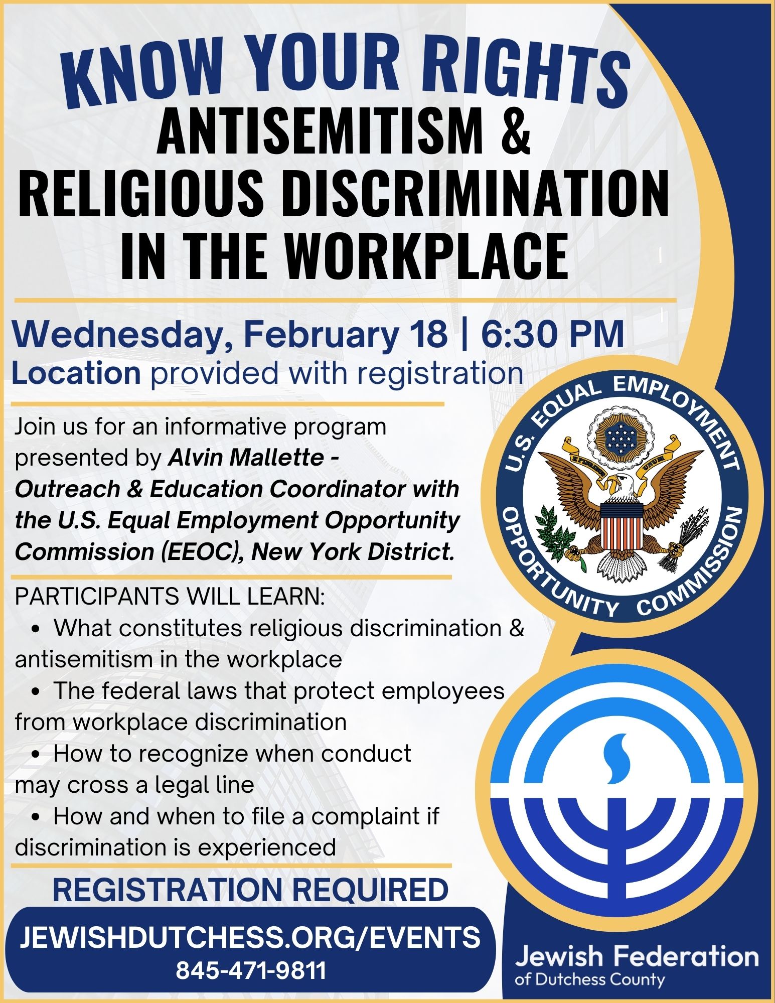 Join us for an informative program on antisemitism and religious discrimination in the workplace, presented by Alvin Mallette, Outreach & Education Coordinator with the U.S. Equal Employment Opportunity Commission (EEOC), New York District.